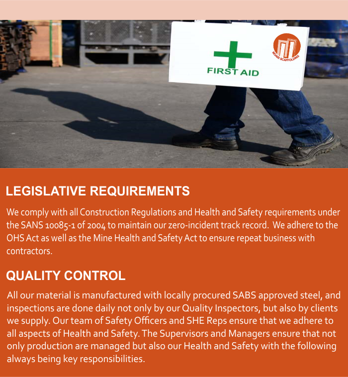 Moabi Scaffolding regards the promotion of health and safety within its operations as an essential part of its responsibilities. Health and Safety is a mutual objective of every manager and employee. It is company policy to use a Safety Management System to do all that is reasonable and practical to prevent personal injury, damage to property and to protect all parties from foreseeable work hazards or financial and economic implications insofar as they come into contact with the operations of Moabi Scaffolding. WE TREAT THE FOLLOWING WITH PRIORITY